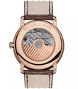 Introducing the unworn Blancpain Villeret Moonphase and Complete Calendar Men’s Watch, Ref# 6654-3642-55B — a sophisticated harmony of poetic design and mechanical finesse. Encased in polished 18k Red Gold, the elegant 40mm round case is just 10.9mm thick, balancing refined presence with comfortable wear. The flat silvered 'Opaline' dial is beautifully arranged with applied polished Roman numerals and gracefully skeletonized leaf-shaped hands, all in matching 18k Red Gold. Commanding attention with graceful precision, the large central seconds hand in polished 18k Red Gold sweeps across the dial with effortless fluidity. Its mirror-like finish catches the light at every angle, adding a refined sense of motion and clarity to the watch’s classic display. This sophisticated layering adds depth and dimension to the dial, offering a sleek, modern interpretation of classic watchmaking elegance. A curved 18k Red Gold hand elegantly sweeps over a recessed center opaline ring to indicate the date, while day and month windows sit just below the 12 o’clock position. At 6 o’clock, a moonphase display adds a lyrical touch, capturing the traditional link between horology and the cosmos. Blancpain’s innovation shines through in its hidden corrector buttons, discreetly placed beneath the lugs. This eliminates the need for recessed pushers, preserving the sleek silhouette and allowing adjustments with just a fingertip. Powering this complete calendar masterpiece is the Blancpain Caliber 6654, a self-winding movement with 321 components, 28 jewels, and a 72-hour power reserve. The transparent sapphire case back reveals the intricate mechanism, framed by a polished 18k Red Gold bezel. Finished with a Brown alligator leather strap and a 18k Red Gold deployant buckle, this timepiece is water-resistant to 30m/99ft (3 ATM), marrying timeless elegance with practical brilliance.