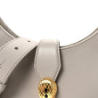 This is an authentic BULGARI Urban Grain Smooth Calfskin Serpenti Ellipse Shoulder Bag in Foggy Opal. This striking bag is crafted of calfskin leather in grey and features a front flap with a golden snake head closure, gold hardware, and adjustable shoulder strap. The flap opens to a pink fabric interior with patch pockets.