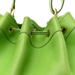 This is an authentic HERMES Veau Gulliver Market Drawstring Bag 28 in Granny. This stylish drawstring bag is crafted of textured, calfskin leather in a vibrant green. The bag features a leather adjustable shoulder strap and a leather cinch cord with gold hardware. The top opens to a spacious suede interior.