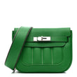 This is the authentic HERMES Veau Swift Mini Sac Berline in Bamboo. This stylish shoulder bag is crafted of luxurious swift calfskin leather in green. The bag features a long shoulder strap with palladium links and a matching turn-lock on the front. This opens the crossover flap to a green leather interior with zipper and patch pockets.
