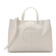 This is an authentic TELFAR Vegan Leather Medium Shopping Bag in White. This tote is crafted of synthetic leather in white with a raised logo on the front. It features short top handles, longer shoulder straps, and a magnetic top that opens to a white fabric interior with a zippered pocket.