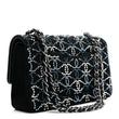 This is an authentic CHANEL Velvet Crystal Medium Double Flap in Black. This chic shoulder flap bag is crafted of soft velvet in black lined with crystals. The bag features a silver chain-link shoulder strap threaded with black leather. The crossover flap opens with a Chanel CC turn-lock to a black leather interior with a zipper and a patch pocket.