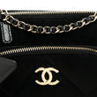 This is an authentic CHANEL Velvet Effect Nylon Shiny Crumpled Calfskin Mini Quilted Chanel 25 Clutch With Chain in Black. This chic shoulder bag is crafted of quilted fabric with a velvet feel. This small clutch has a CC logo on the front zipper pocket, a rear pocket, a leather threaded chain-link strap and a star shaped mirror on the zipper pull. The top zipper opens to a black nylon fabric interior.