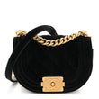 This is an authentic CHANEL Velvet Quilted Mini Boy Messenger Bag in Black. This classic shoulder bag is crafted of velvet in black. This bag features a aged gold chain strap with a velvet and leather shoulder pad. The front flap has a aged gold CC turn lock that opens to a matching leather interior with a patch pocket.