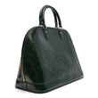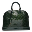 This is an authentic LOUIS VUITTON Vernis Alma GM in Blue Nuit. This fabulous structured tote is constructed of stunning Louis Vuitton embossed vernis leather. It features a strong, solid base and sturdy rolled handles, brass hardware on the handle rings, base feet and a double zipper. The interior is lined with dark blue fabric and includes patch pockets.