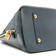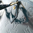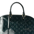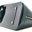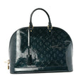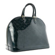 This is an authentic LOUIS VUITTON Vernis Alma GM in Blue Nuit. This sleek stylish tote is created out of Louis Vuitton monogram embossed vernis patent leather in dark blue. The bag has smooth rolled leather top handles and polished hardware including a double 3/4 wrap-around zipper with a padlock and a hanging clochette. The zipper opens to a blue fabric interior with patch pockets.