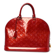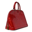 This is an authentic LOUIS VUITTON Vernis Alma GM in Rose Indien. This bowler style tote in the large size is created of monogram embossed vernis patent leather in dark pink for a stunning look. The bag also features rolled leather top handles and a double brass wrap around zipper that opens to an interior of matching fabric with pockets.