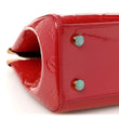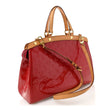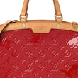 This is an authentic LOUIS VUITTON Vernis Brea MM in Rose Indien. This sophisticated tote is crafted of Louis Vuitton monogram-embossed patent leather in dark pink. The bag features vachetta cowhide leather trim, top handles with brass hardware. The overextended top zipper opens the bag to a dark pink fabric interior with zipper and patch pockets.