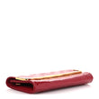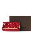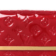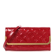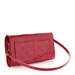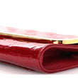 This is an authentic LOUIS VUITTON Vernis Rossmore MM in Pomme D'Amour. This classic pochette is crafted of monogram embossed vernis patent leather in a deep red. The clutch has a classic flap shape with a brass Louis Vuitton signature frame. The interior features leather card slots and a fabric zippered compartment.