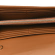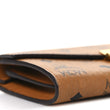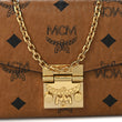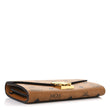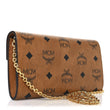 This is an authentic MCM Visetos Large Patricia Wallet On Chain in Cognac. This wallet on chain is crafted of MCM's signature visetos coated canvas in brown with the MCM monogram and a removable chain shoulder strap. The flap opens to a matching brown leather and fabric interior with card slots, patch pockets, and a zipper compartment.