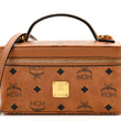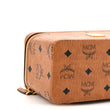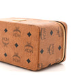 This is an authentic MCM Visetos Vanity Case in Cognac. This bag is crafted from traditional MCM monogram visetos coated canvas. The case features a brown leather top handle and matching trim, an optional, adjustable shoulder strap and polished gold hardware. The wrap around zippers open to a beige microfiber interior with patch pockets.