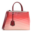 This is an authentic FENDI Vitello Elite Geometric Degrade Regular 2Jours Tote in Red. This tote is crafted of multi-textured calfskin leather in different shades of red and white. The shoulder bag features rolled leather top handles, expansive sides with a polished silver top frame, an optional shoulder strap, and a wide open top. The top frame unsnaps to a partitioned burgundy fabric interior with zippered and patch pockets.