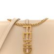 This is an authentic FENDI Vitello Grace Fendigraphy Wallet on Chain in Camelia. This crossbody wallet is crafted of beige calfskin leather and features a removable, gold-tone chain-link shoulder strap and a front flap with a metal Fendi logo. This unique shoulder bag opens to a brown suede interior with card slots.