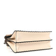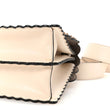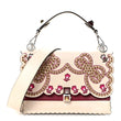 This is an authentic FENDI Vitello Liberty Lucido Flowers and Bows Scalloped Studded Kan I Shoulder Bag in Camelia and Black Cherry. This bag is crafted of smooth calfskin leather in beige with dark maroon floral embroidery accents and stitching. This shoulder bag features a removable top handle with silver rings on the anchor to hold bag charms, an optional shoulder strap and gold tone pyramid stud closure. The front opens to a taupe suede partitioned interior with a patch pocket.
