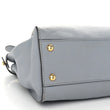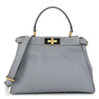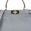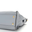 This is an authentic FENDI Vitello Seta Shiny Nappa Medium Peekaboo Iconic Satchel in Ardesia and Amido. This chic tote is finely crafted of soft pale gray calfskin leather. This medium-sized bag features gold and blue squared turn locks on either side that when released, relax the outer layer to reveal the inner panel of a beige leather. The handbag can be carried as a shoulder bag with the optional adjustable strap or as a tote by the inner handle.