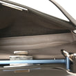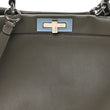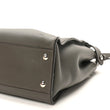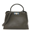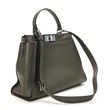 This is an authentic FENDI Vitello Seta Shiny Nappa Medium Peekaboo Iconic Satchel in Carbone Grigio Polvere. This chic tote is finely crafted of soft finely grained gray calfskin leather. This medium sized bag features polished silver and matte blue squared turn locks on either side that when released, relax the outer layer to reveal the inner panel of light grey leather that the gray leather handle is attached to. It can be carried as an adjustable shoulder bag with the outer layer, or as a tote by the inner handle.