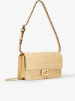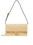 COMPACT BAGUETTE WALLET WITH FLAP AND FF CLOSURE INTERNAL COMPARTMENT WITH 6 CARD SLOTS DOUBLE SHOULDER STRAP, ONE ADJUSTABLE LEATHER AND ONE REMOVABLE THIN CHAIN, FOR CARRYING UNDER THE ARM, CROSS-BODY, OR AS A CLUTCH MADE OF JACQUARD FABRIC WITH THE ICONIC FF MOTIF IN VISCOSE RAFFIA BEIGE CALFSKIN INTERIOR AND DETAILS GOLD-FINISH METAL ACCESSORIES DIMENSIONS: W 21 X H 11.5 X D 5 CM MADE IN ITALY