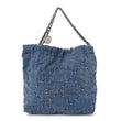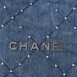This is an authentic CHANEL Washed Denim Quilted Studded Small Chanel 22 in Blue. This stylish handbag is crafted of diamond-stitched blue denim studded throughout. The bag features denim threaded silver chain shoulder straps and a matching Chanel logo on the front. The top opens with magnetic closure leads to a blue fabric interior with a zipper pocket and matching removable pouch.