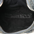 This is an authentic BALENCIAGA Washed Frayed Denim Crystal Le Cagole Shoulder Bag XS in Blue. This stylish and structured handbag is crafted crafted of light blue denim. The bag features a matching shoulder strap with silver links, crystal studs, and a matching pouch with a heart shaped mirror. The top unzips to a black fabric compact interior with a zipper pocket.