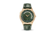 Luxury Patek Philippe Women’s Complication World-Time, 18k Rose Gold, 36mm and Reference 7130R-014. The masters achieve a rethinking of the World Time classic by decorating this model with an original, modern and elegant olive green color. In addition, its central part is a tribute to the rare art of masters who managed to manually create a guilloche pattern in the form of a "Panier" wicker basket. Look good on dial applied 18k Rose Gold index hour markers. Moving outward one-step, we find a 24-hour disk divided into day and night zones, distinguished by their color and symbols of the Sun and Moon. The City Disc, showing all 24 time zones at any given time with their respective cities, is also olive green, but the city names are very legible and printed in large white type. To change the time zone, simply press the button at 10 o'clock and all readings will be adjusted at the same time. Strict Dauphine-inspired central hour and minute hands in 18k Rose Gold add a special touch to the watch. A polished 18k rose gold screw-down crown with a ribbed edge for easy grip and the Patek Philippe logo is located on the right side of the case. The dial closed by a Scratch-resistant Sapphire Crystal and sapphire-crystal case back which allows of the case, allows you to see the magical work of the movement. The watch is equipped Luxury fixed polished 18k Rose Gold bezel set with 62 diamonds (~0.82 ct.). The watch Patek Philippe Caliber 240 HU Self-winding mechanical movement, containing 33 Jewels, and has a power reserve of min. 48 hours. This model presented on shiny olive green Calfskin leather hand-stitched strap. It zips up 18k Rose Gold Prong buckle set with 27 diamonds (~0.21 ct.). The water resistance is up to 30m/100ft (3 ATM).