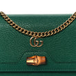This is an authentic GUCCI Wonka Grain Calfskin Diana Chain Wallet in Black. This stylish wallet on chain is crafted of grained calfskin leather in black with an aged gold strap, GG logo, and bamboo accent on the front. The wallet unsnaps to a black leather interior interior with card slots, patch pockets, and a zipper compartment.