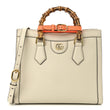 This is an authentic GUCCI Wonka Grain Calfskin Small Diana Tote Bag in Mystic White and Orange Fluo. This shoulder bag is crafted of lovely calfskin leather in white. The bag has a sturdy bamboo top handle and featuring an interlocking GG logo, the handbag opens to a beige microfiber interior with a patch pocket.