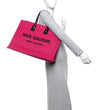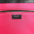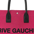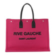 This is an authentic SAINT LAURENT Wool Rive Gauche Tote in Fuchsia. This tote is crafted of pink wool with "Rive Gauche, Saint Laurent" printed in black across the front. The tote features black rolled leather handles and is open to a matching interior with a zipper pocket.