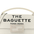 This is an authentic FENDI X MARC JACOBS Nappa Logo Phone Baguette in White and Black. This chic baguette was created in collaboration with Marc Jacobs and is crafted of Fendi monogram stamped leather in black and white. The bag features a smooth leather top handle, an black leather shoulder strap, and silver hardware. The crossover flap opens with a prominent magnetic silver FF logo detail to a grey satin interior with a patch pocket.