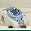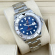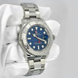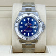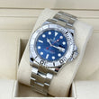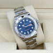 Unworn watch Rolex Yacht-Master 40, Oystersteel and platinum case, 40mm, Ref# 126622-0002. Rolex Yacht-Master with a strong-looking profile, combines functionality and nautical style, looks confident on the wrist of a navigator or skipper. An excellent chronometer, it features a Bright blue dial with exceptional readability in all conditions, especially in the dark, thanks to the Chromalight display with a sophisticated matte finish and a date window at the 3 o'clock position. Wide hands with the Mercedes logo and hour markers - triangles, circles, rectangles - are filled with luminescent material with a long glow. A well-readable minute scale is applied along the outer contour of the dial. The ribbed, easy-to-grip Triplock screw-down crown features a triple water-resistance system in Oystersteel with Rolex logo and built-in crown protection. The dial is covered with a scratch-resistant sapphire crystal with a Cyclops lens at the 3 o'clock position. The impressive bidirectional 60-minute graduated with raised numerals bezel crafted from platinum, giving the watch a silvery white and brilliant luster that creates an unmistakable sense of luxury. The bezel can be easily rotated thanks to its serrated edge for superior grip. The model is powered by the in-house automatic Rolex mechanical movement caliber 3235, contains 31 jewels and has an approximate power reserve of approximately 70 hours. This delicious watch is presented on an Oyster bracelet with three-piece solid links of Oystersteel. It is fitted with Folding Oysterlock safety clasp with Easylink 5 mm comfort extension link. Water resistant up to 100m/330ft (10 ATM)
