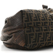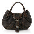 This is an authentic FENDI Zucca Nappa Nuvolata Vitello Tortuga Small Spy in Tobacco and Moro. This chic bag is crafted of dark brown leather with FF Zucca canvas at the center. It features a tortoise textured leather handles and a snap closure with a cursive Fendi logo. The bag opens to a beige fabric interior with a patch pocket.
